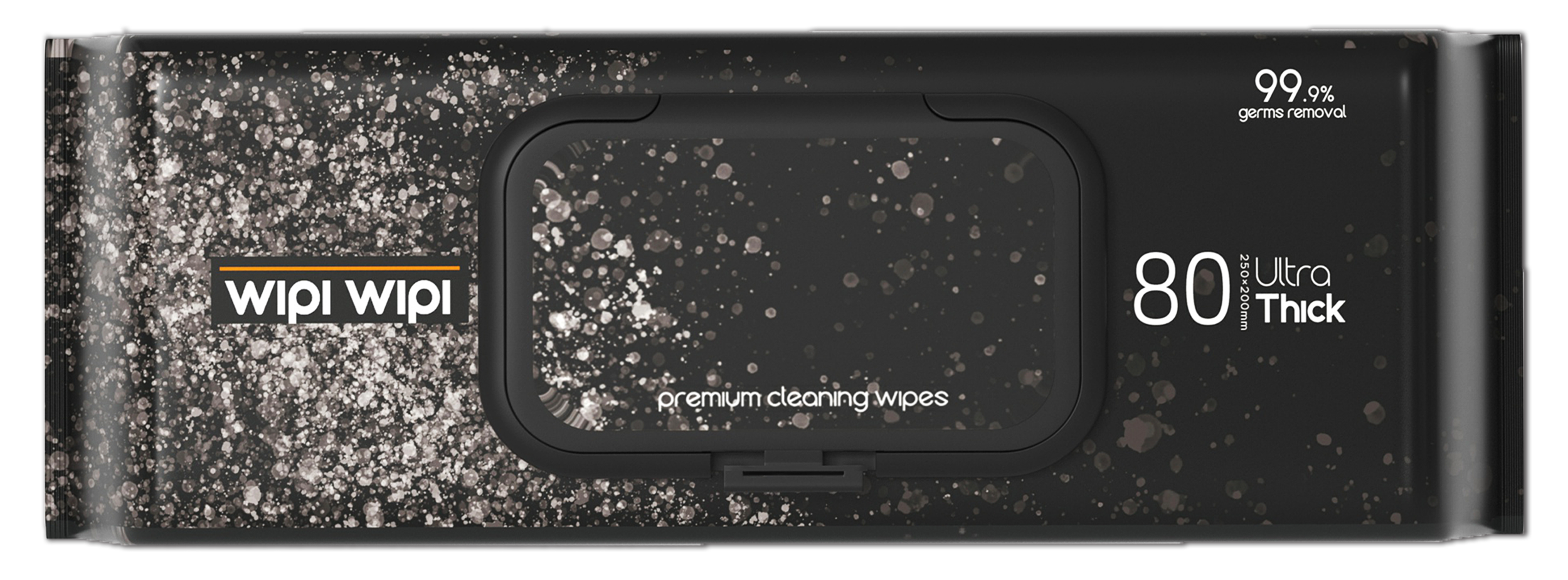 A package of Wip Wip premium cleaning wipes, black with white and orange text, containing 80 thick ultra wipes measuring 25 by 20 centimeters, with a transparent window showing the wipes inside.